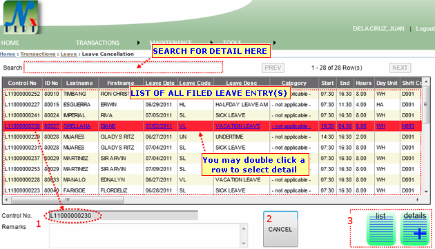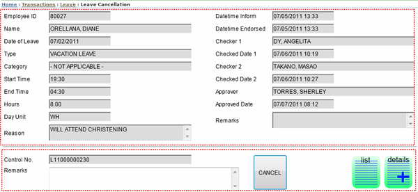 2. CANCEL button: Click this button to canel filed leave entry.