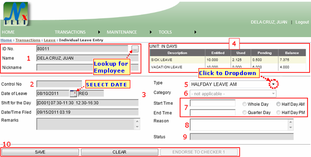 1. Employee's Information: This is where the current logged user's basic information appears. With ID No., Name, and Nickname. A user may file an entry for another employee (depending on the system's access grant for users) by clicking the lookup button for employee.
