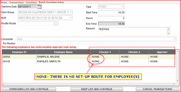 • "DISREGARD LIST AND CONTINUE" will save and endorse those transactions that does not have any errors and will just disregard those employees listed for review for certain validation like no route.