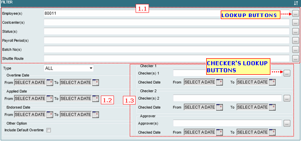 1.1You can filter Overtime Report by its Employee, Costcenter, Status, Payroll Period, Batch No, Shuttle Route.
