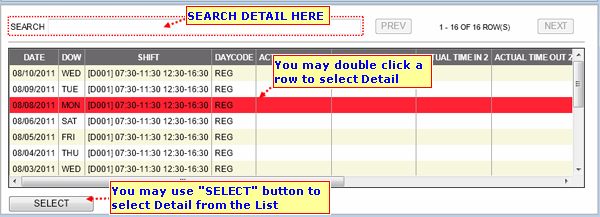 • You may select a row from the list and click the button SELECT to select employee. (Selected row is highlighted with red color background)