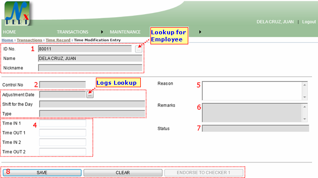 1. Employee's Information: This is where the current logged user's basic information appears. With ID No., Name, and Nickname. A user may file an entry for another employee (depending on the system's access grant for users) by clicking the lookup button for employee.