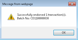 This message from the WEB prompts when transaction was successfully endorsed. Click OK to continue.
